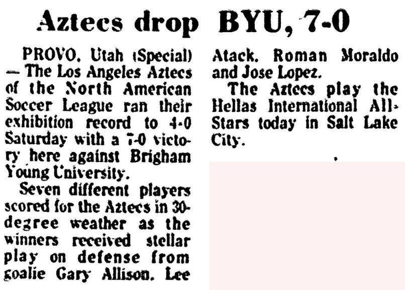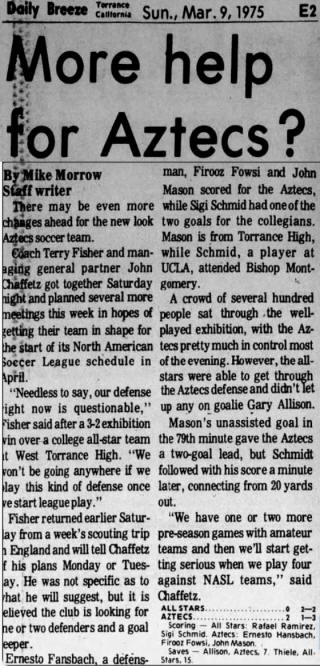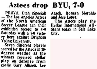All-Stars (Salt Lake City, Utah) Date: March 30, 1975 Aztecs won 7-0 Attendance: Goals: Aztecs- |