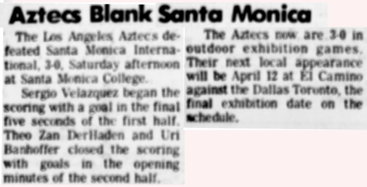 International (Santa Monica, California) Date: March 21, 1975 Aztecs won 3-0 Attendance: 200 Goals: Aztecs-Sergio Velazquez, Theo Van Derlladen, Uri Banhoffer |