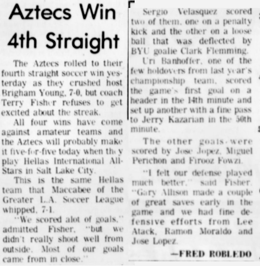 University Cougars Date: March 29, 1975 Aztecs won 7-0 Attendance: Goals: Aztecs-Sergio Velazquez (2), Uri Banhoffer, Jerry Kazarian, Jose Lopez, Firooz Fowzi, Ramon Moraldo |