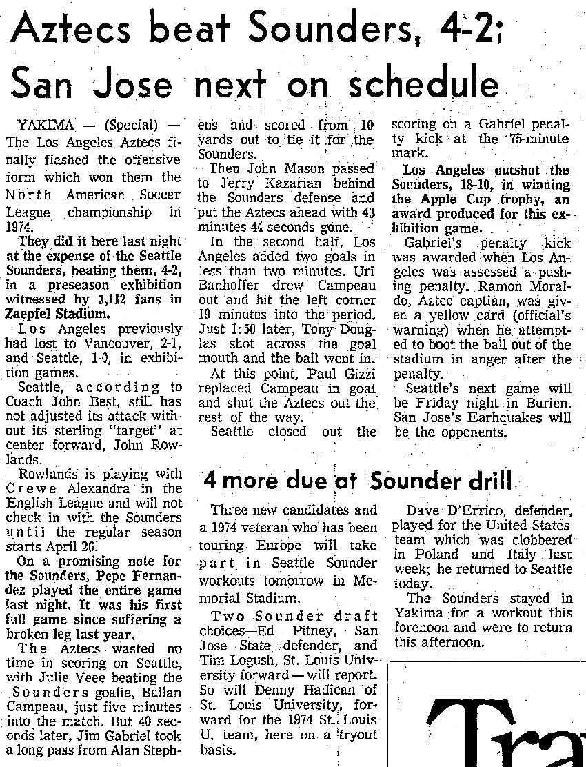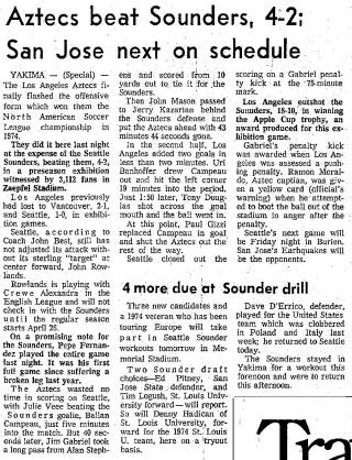 (Yakima, Washington) Date: April 7, 1975 Sounders lost 4-2 Attendance: 3,500 Goals: Sounders-Jim Gabriel (2) Aztecs-Juli Veee, Jerry Kazarian, Uri Banhoffer, Tony Douglas |