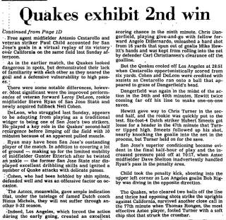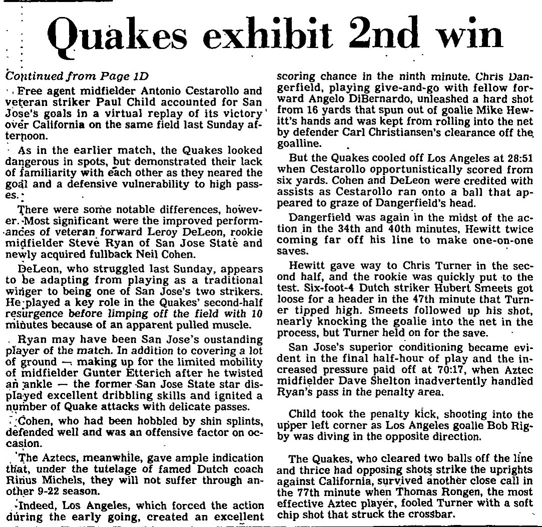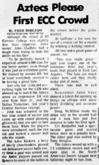 | Los Angeles Aztecs vs. San Jose Earthquakes Date: March 2, 1979 Aztecs lost 2-0 Attendance: 2,816 Goals: Earthquakes-Antonio Cestarollo, Paul Child |