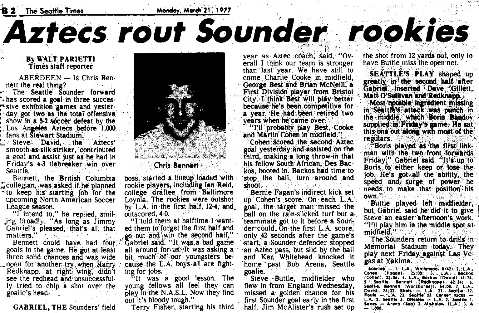 (Aberdeen, Washington) Date: March 20, 1977 Aztecs won 5-2 Attendance: Goals: Aztecs-Ken Whitehead, Martin Cohen, Steve David, Des Backos (2) Sounders-Chris Bennett (2) |