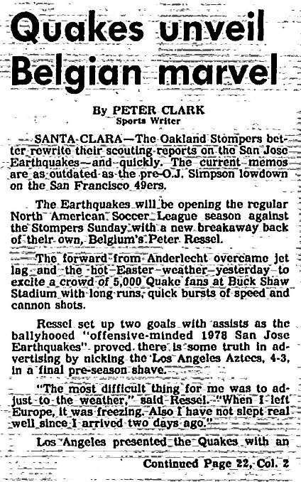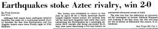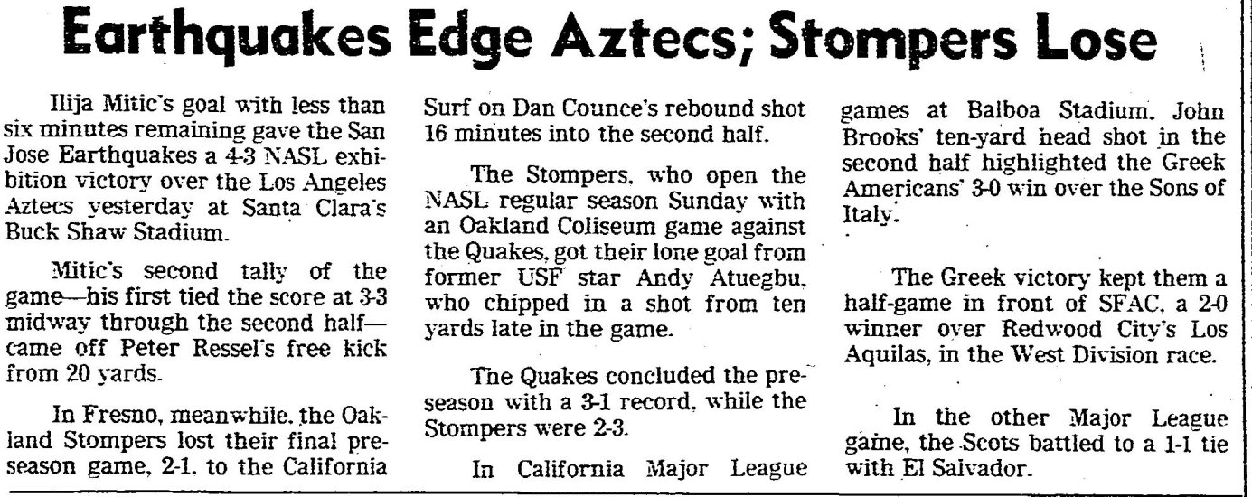 (Santa Clara, California) Date: March 26, 1978 Aztecs lost 4-3 Attendance: Goals: Aztecs-Ramon Mifflin, Rudy Ybarra, Steve David Earthquakes-Own Goal, Dusan Lukic, Ilija Mitic (2) |