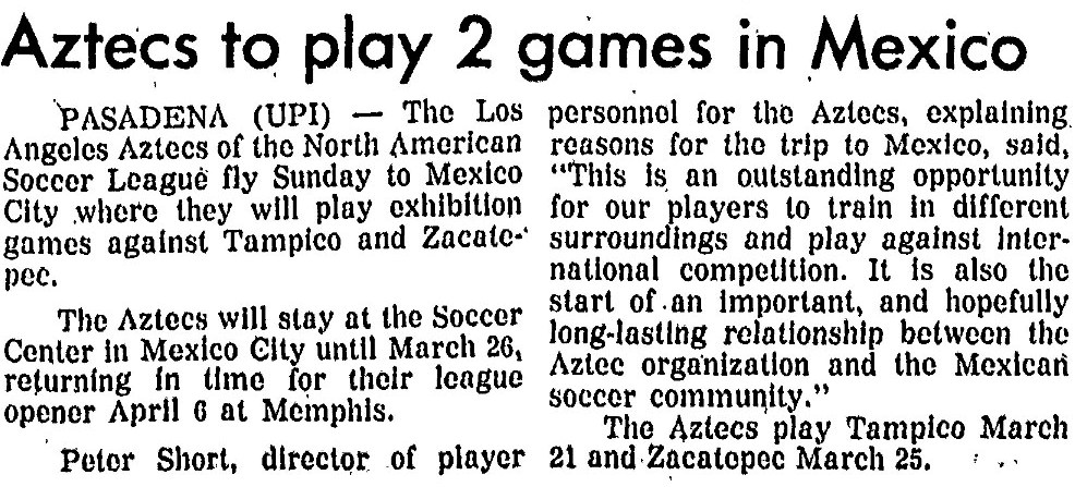 | Club America (Mexico) at Los Angeles Aztecs Date: April 21, 1974 Aztecs lost 2-1 Attendance: 14,211 Goals: Aztecs-Tony Douglas Club America-Sergio Ceballos, Castro |