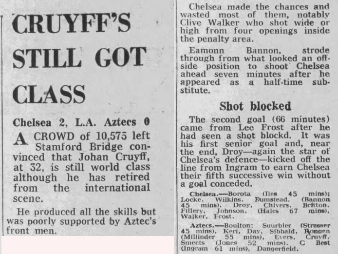 | Los Angeles Aztecs at Chelsea (England) Date: October 17,1979 Aztecs lost 2-0 Attendance: 10,575 Goals: Chelsea-Eamon Bannon, Lee Frost |