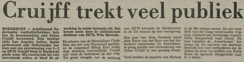 | Los Angeles Aztecs at F.C. Utrecht (Utrecht, Netherlands) Date: October 5, 1979 Aztecs lost 4-1 Attendance: 15,000 Goals: Aztecs-Johan Cruyff Utrecht-Leo Van Veen (2), Ron Van Oosterom (2) |