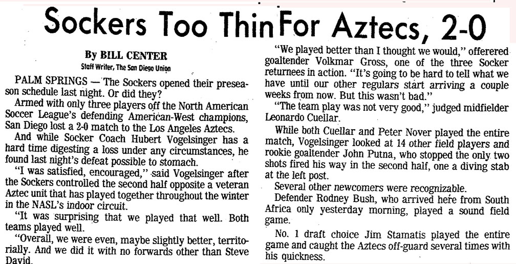 Springs, California) Date: March 1, 1980 Aztecs won 2-0 Attendance: Goals: Aztecs-John McGrane, Mihalj Keri |