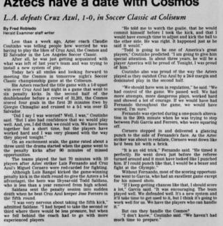 (Los Angeles Soccer Tournament) Date: March 28, 1980 Aztecs lost 3-1 Attendance: 24,219 Goals: Aztecs-Javier Aguirre Cosmos-Giorgio Chinaglia, Julio Cesar Romero |