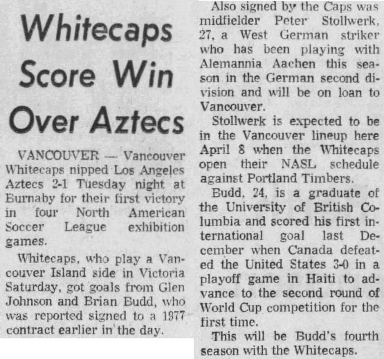 | Los Angeles Aztecs at Vancouver Whitecaps Date: March 22, 1977 Aztecs lost 2-1 Attendance: 1,500 Goals: Whitecaps-Glen Johnson, Brian Budd Aztecs-Steve David |