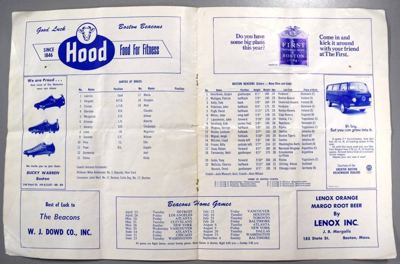 | Santos (Brazil) at Boston Beacons Date: July 8, 1968 Beacons lost 7-1 Attendance: 18,431 Goals: Beacons-Lloyd McLean, Santos-Pele, Toninho (2), Mongaluio, Maria, Eliesa, Douglas |
