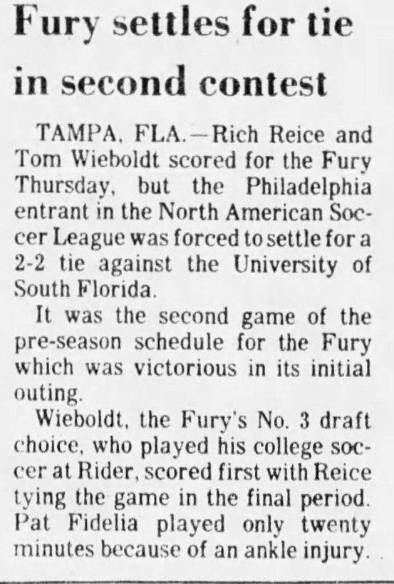 | Philadelphia Fury vs. New England Tea Men Date: March 8, 1979 Fury lost 3-1 Attendance: Goals: Fury-Pat Fidelia Tea Men-Brian Anderson, Roger Gibbins, Scott Courtney |