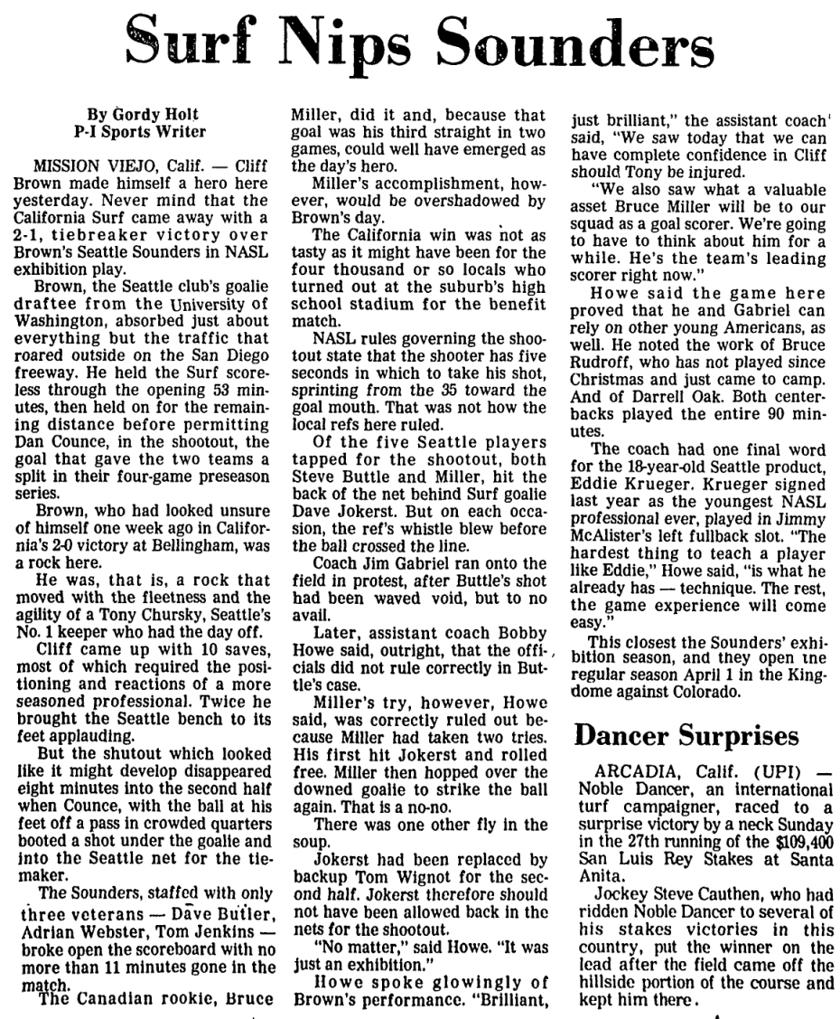 Goals: Surf-Steve Moyers      Sounders-Dave Butler, Bruce Miller (2)