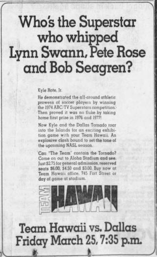 | Dallas Tornado at Team Hawaii Date: March 25, 1977 Tornado won1-0 Attendance: 5,056 Goals: Tornado-Freddie Garcia |