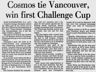 | Vancouver Whitecaps at New York Cosmos (TACC) Date: May 26, 1980 Cosmos tied 1-1 Attendance: 60,384 Goals: Cosmos-Giorgio Chinaglia Whitecaps-Ray Hankin |