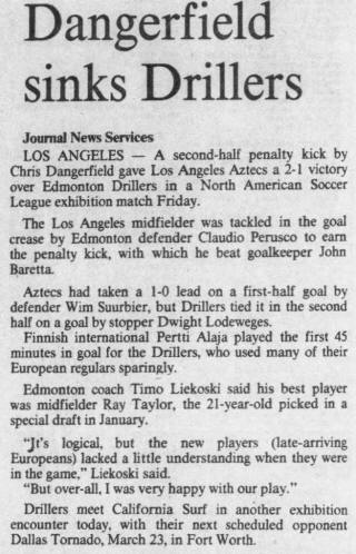 | Edmonton Drillers vs. Portland Timbers Date: March 30, 1980 Drillers won 1-0 Attendance: Goals: Drillers-Dwight Lodeweges |