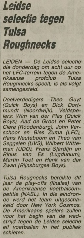 | Tulsa Roughnecks at Leiden (Leiden, Netherlands) Date: October 4, 1979 Roughnecks won 4-1 Attendance: Goals: Roughnecks-Steve Earle, Alan Woodward, David Nish, Billy Sautter |