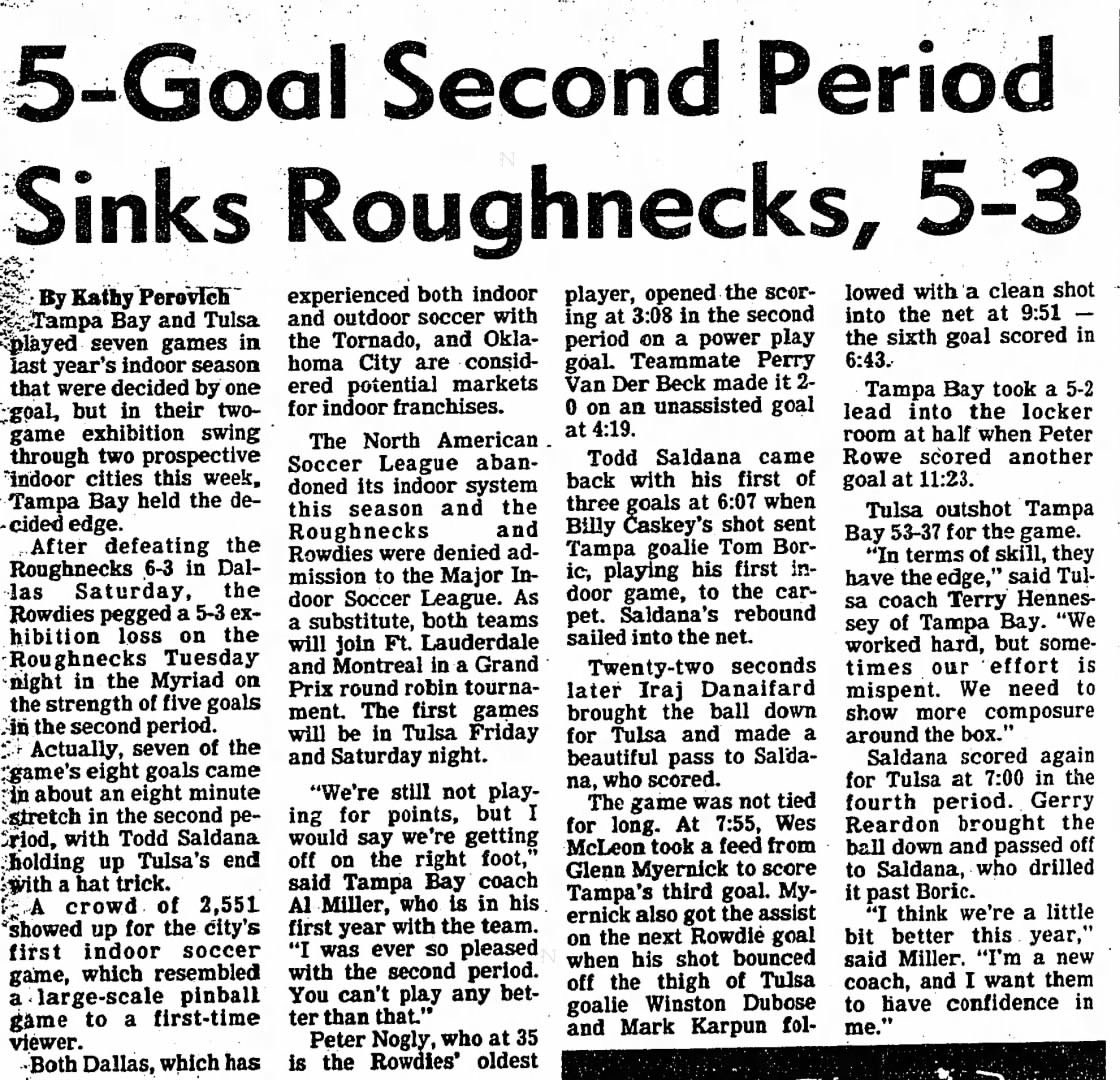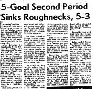 | Tulsa Roughnecks vs. University of Tampa Date: March 24, 1982 Roughnecks won 4-1 Attendance: Goals: Roughnecks-Ole Mikkelsen (2), Laurie Abrahams (2) |