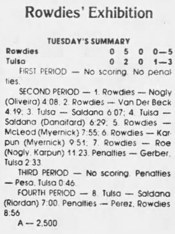 Oklahoma) Date: March 17, 1979 Roughnecks won 2-0 Attendance: 298 Goals: Roughnecks-Laurie Abrahams, Steve Ralbovsky |