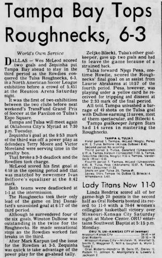 Roughnecks (Bixby, Oklahoma) Date: April 9, 1983 Roughnecks won 4-0 Attendance: Goals: Roughnecks-Laurie Abrahams (2), Adam Krupa, Own Goal |